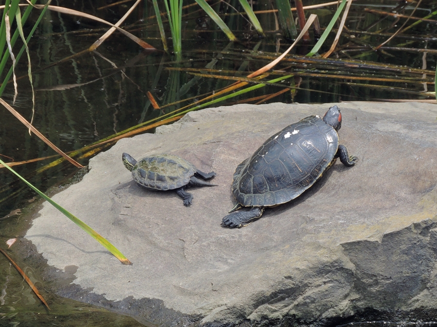 いい天気なので、カルガモと亀さんが並んでひなたぼっこしてました。